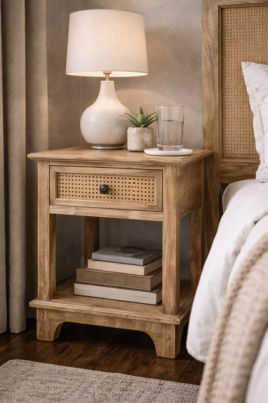 Discover the Willow Cane Collection featuring solid mango wood furniture with woven cane detailing. Timeless bedroom and storage pieces with natural warmth and texture.