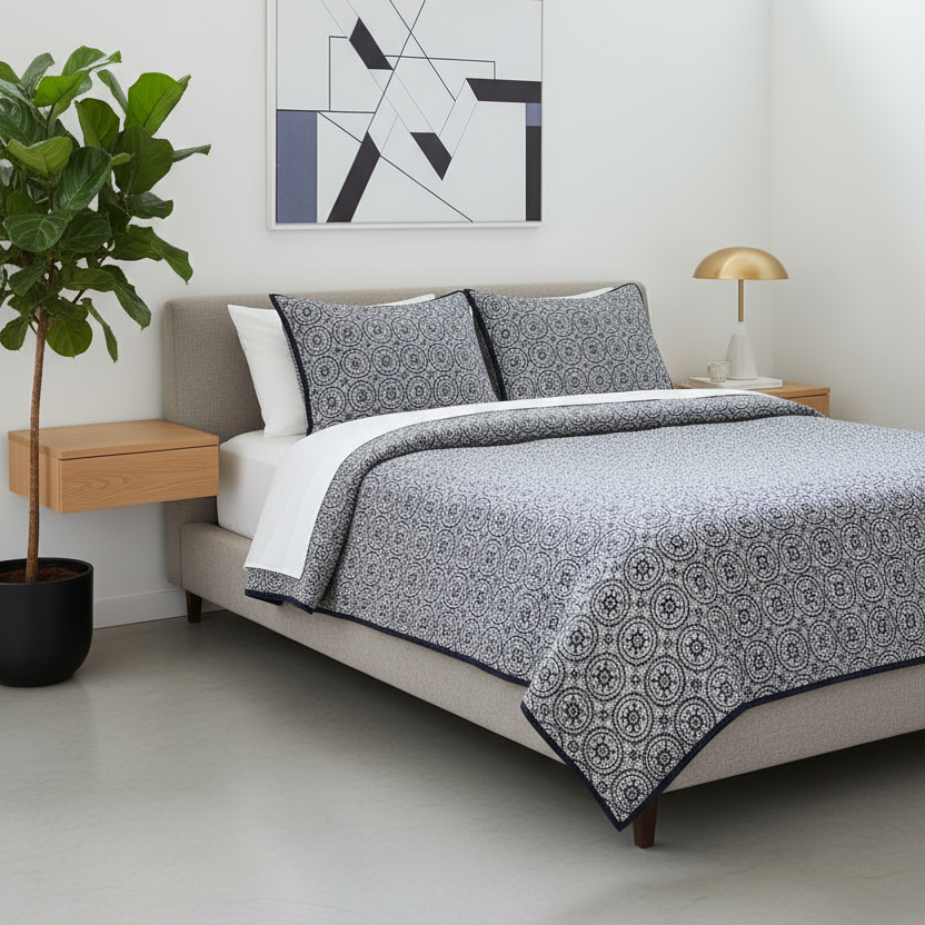 This handcrafted reversible quilt is made from 100% pure cotton, offering a soft, breathable feel perfect for year-round comfort. It features beautiful Indian hand-block prints, where artisans use traditional techniques to create intricate, vibrant designs. The quilt is reversible, with one side showcasing bold patterns and the other offering a more subtle, complementary look, allowing you to switch up your bedroom's style easily.
