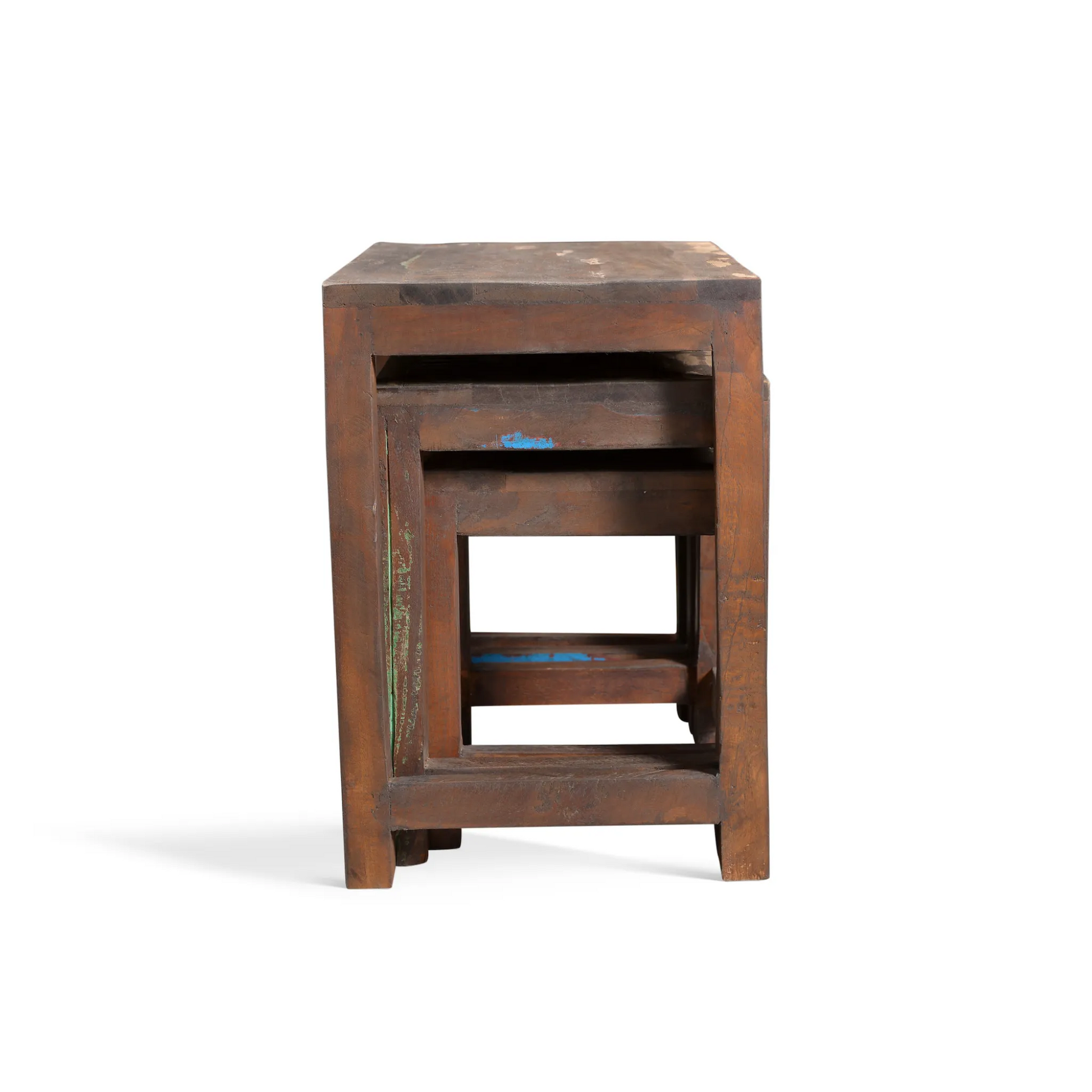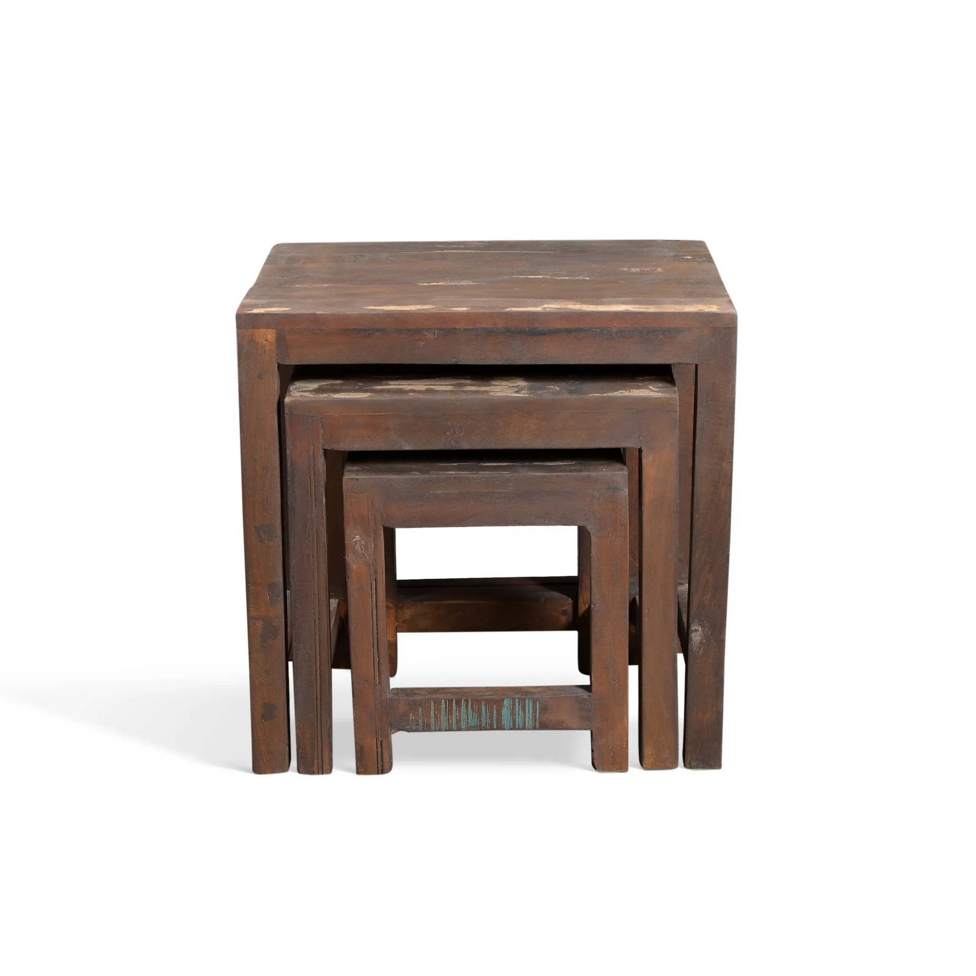 Experience pure luxury with our Reclaimed Wood Nest of Tables. Each piece has a unique history, having been previously used in Indian railway trestles. With its natural imperfections and sealed salvaged materials, this set of 3 tables exudes elegance and durability. Crafted from solid reclaimed wood, no two tables are alike, making this a truly exclusive addition to your home.